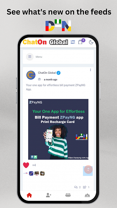 ChatOn Global is a powerful platform that connects people from all corners of the world. Regardless of where you are, you can easily connect with friends, family, and loved ones through ChatOn Global. To learn more tap ChatOn Global Privacy Policy, it's easy, fast & reliable. Powered & Licensed from D-N 🇳🇬 Developers Technologies Company Inc.
